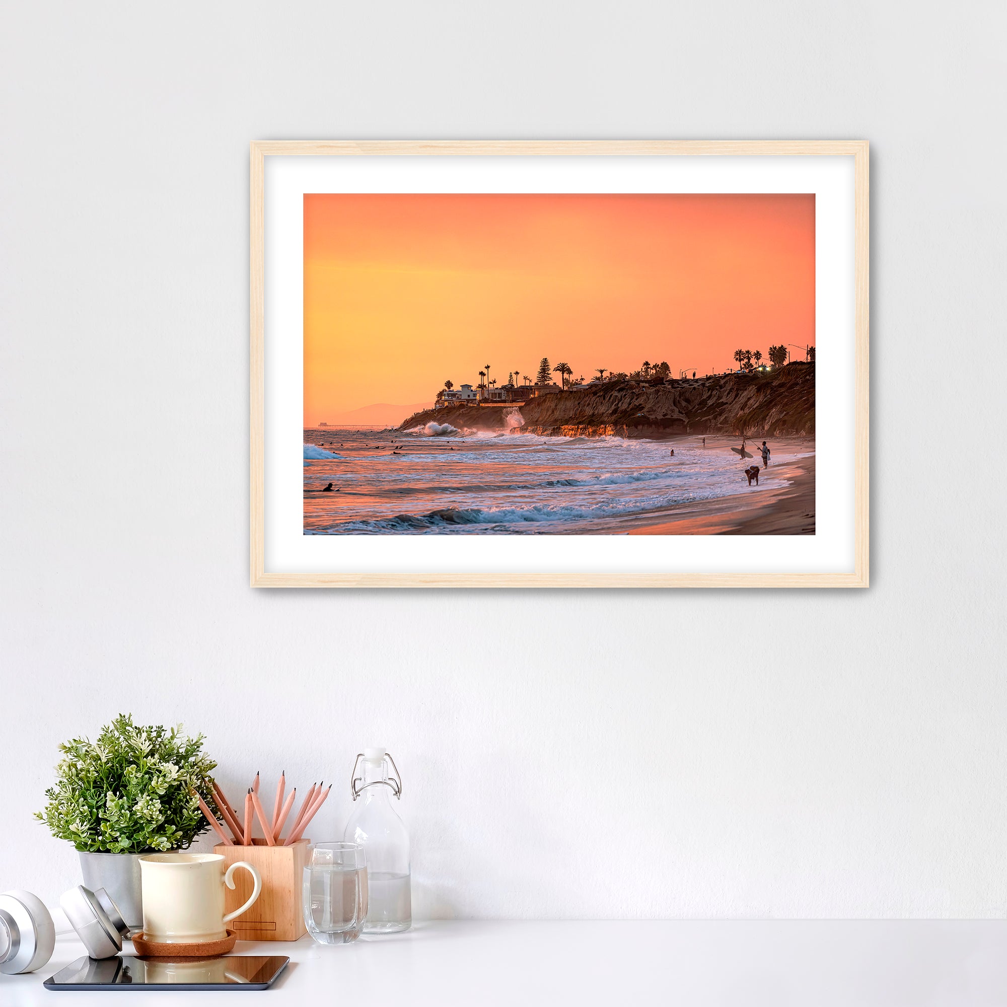 Framed photograph of a colorful wave at sunrise with the partially deconstructed Carlsbad power plant in the background.